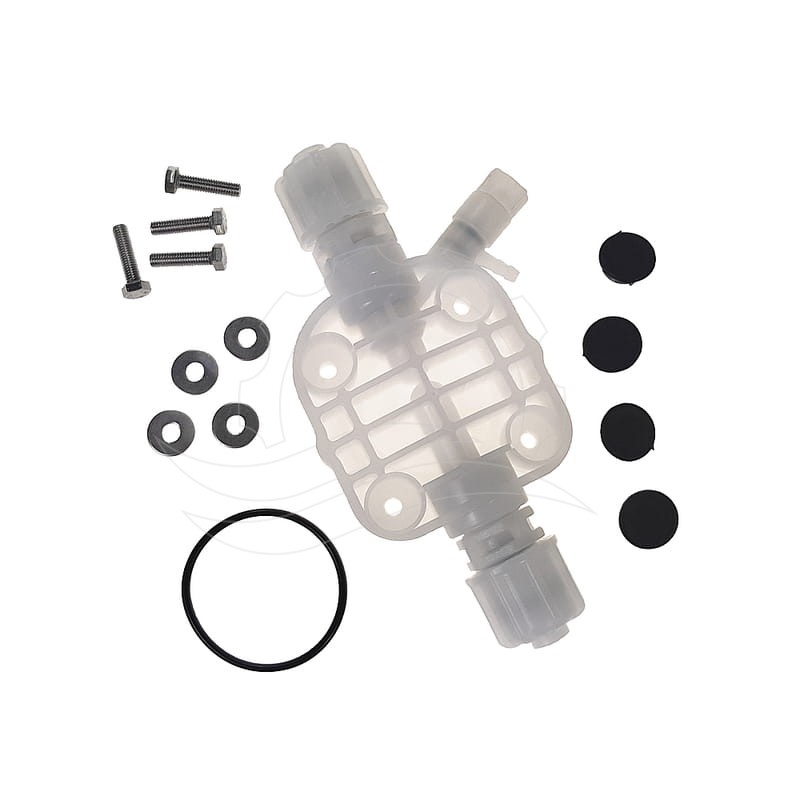 Dávkovací čerpadlo Verderdos VE1-C s těsněním EPDM. Hlava je vybavena ventily a odvzdušňovacím otvorem. Opravná sada vhodná pro alkalické chemikálie.