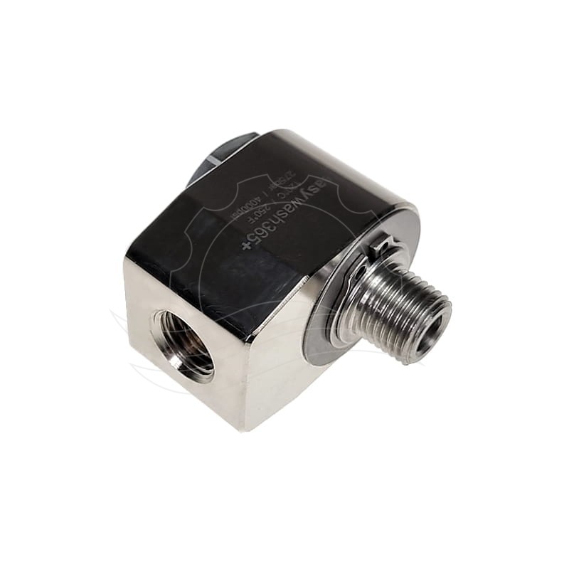 Úhlový otočný konektor Easywash365+ G3/8''F-G3/8''M. Pouzdro z niklované mosazi. Hřídel z nerezové oceli s průměrem průtoku 7 mm. Maximální tlak 275 barů, maximální teplota 120 °C.