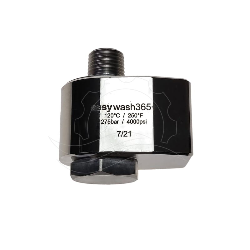 Otočný úhlový konektor Easywash365+ G3/8"F-G1/4"M. Pouzdro z niklované mosazi. Hřídel z nerezové oceli s průměrem průtoku 7 mm. Maximální tlak 275 barů, maximální teplota 120 °C.