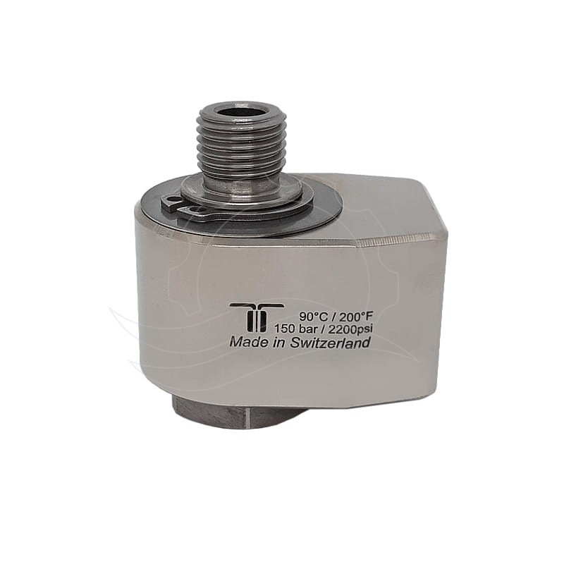 Úhlový otočný kloub Mosmatic WDG G1/4"F-G1/4"M. Pouzdro z niklované mosazi. Hřídel z nerezové oceli s průměrem průtoku 7 mm. Maximální tlak 150 bar, maximální teplota 90 °C.