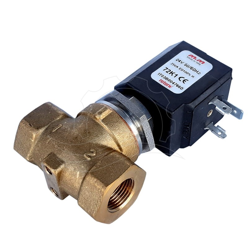 Velmi dobrý solenoidový ventil od italské značky M&M. Cívka je napájena 24V AC. Je instalován z výroby v automyčkách Ehrle a TixExpress. Používá se ve strojích s přídavným programem aktivního pěnového mytí. Úkolem solenoidového ventilu je otevřít průtok vysokotlaké vody do vybrané trysky.