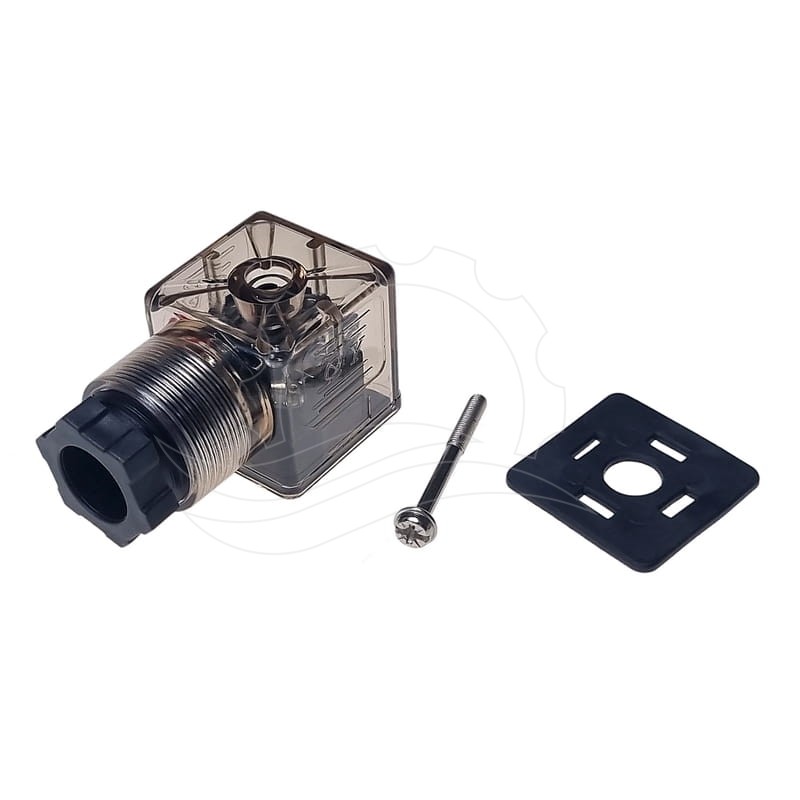 Průhledná zástrčka solenoidového ventilu typu A. Vhodná pro 24 V. Vybavena LED podsvícením. Součástí balení je těsnění a šroub.